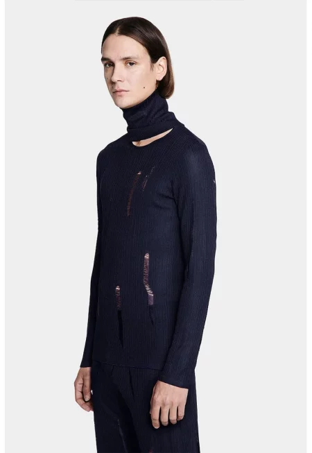 Блуза с висока яка от плетиво с прозрачност и изрязан детайл - Тъмносин