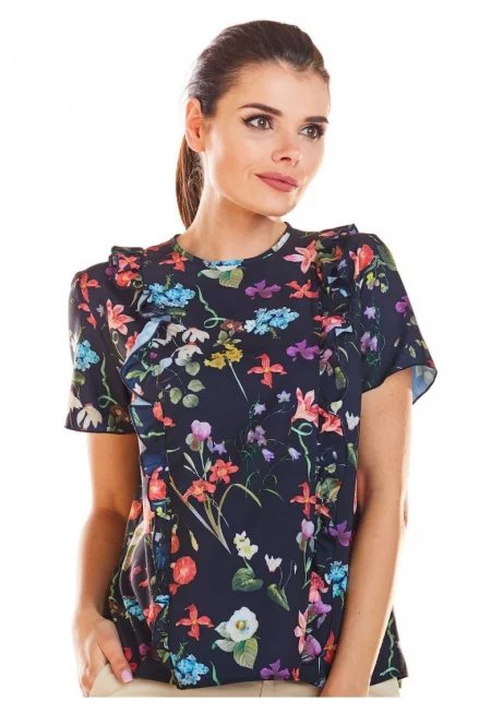 Дамска блуза -  Полиестер - Морско синьо - модел цветя
