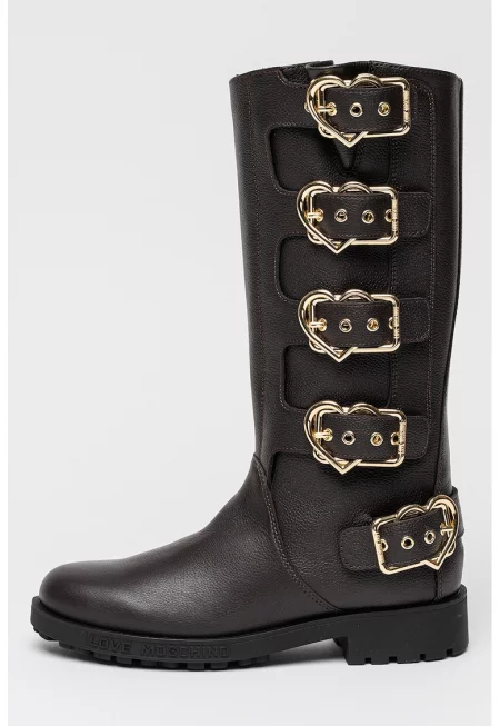 Високи кожени ботуши с декоративна каишка с тока - Тъмнокафяв