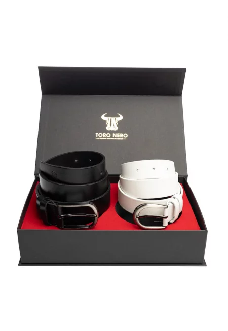 Дамски и мъжки комплект колани - естествена кожа - черно и бяло - Elegant-Basic