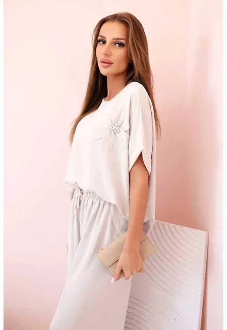 Комплект блуза с къс ръкав и флорален детайл и панталон - Един размер
