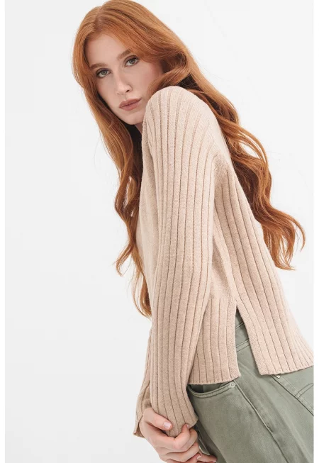 Пуловер  V-образно деколте - акрил - найлон - бежов