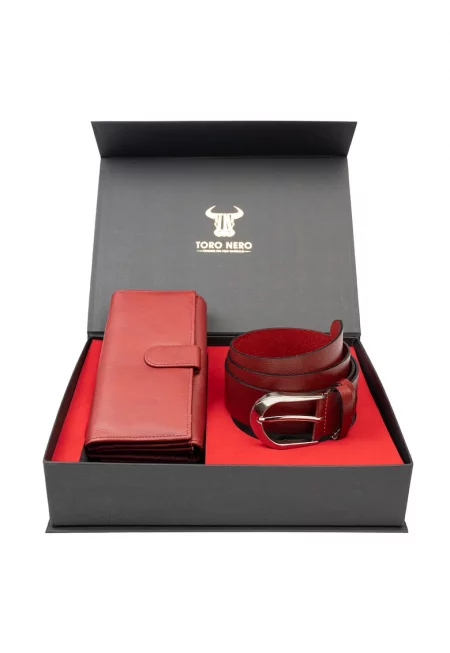 Комплект дамски портфейл и колан естествена кожа червен Gia-Slim