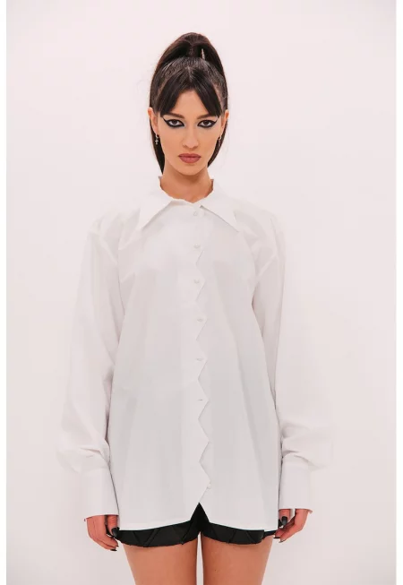 Уголемена риза с паднали ръкави и копчета с перлен блясък - Бял