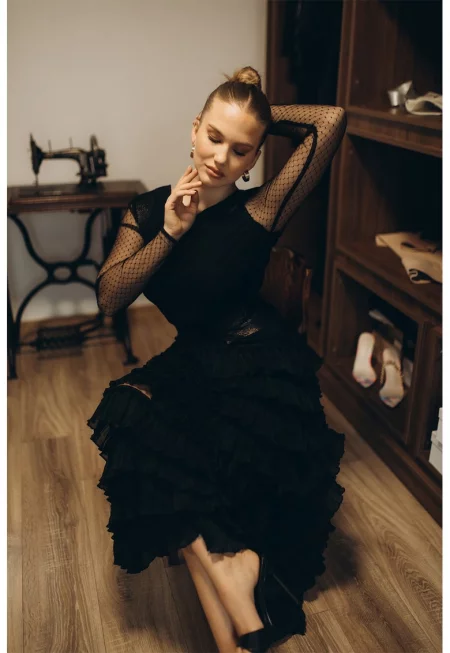 Дълга рокля с набиране - Черен/Прозрачен