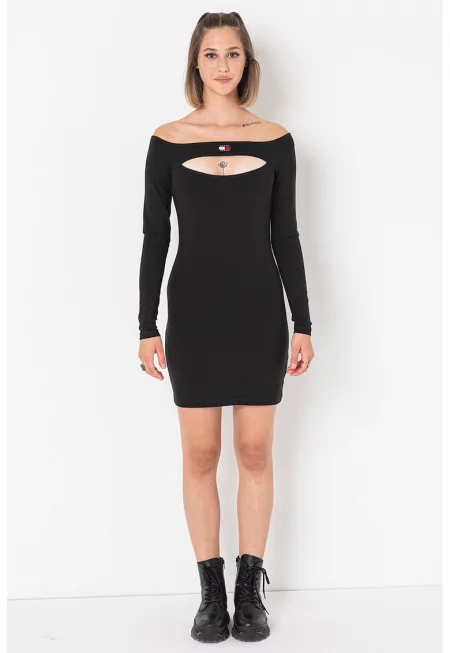Къса рокля с голо рамо и отвор - Черен