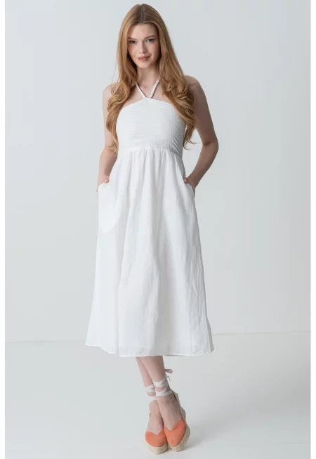 Разкроена рокля от лен и памук с панделка - Мръснобял/Светло бежово