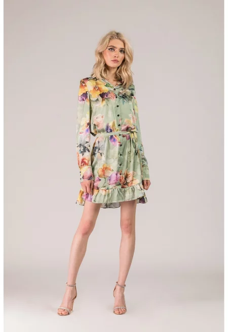 Флорална рокля тип риза с набран подгъв - Зелен/Жълт/Лилав