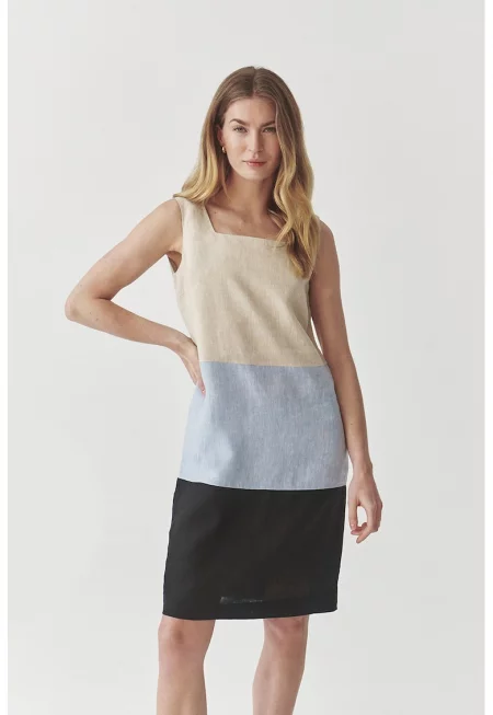 Ленена рокля Rokna 2 без ръкави - Черен/Светлосин/Крем