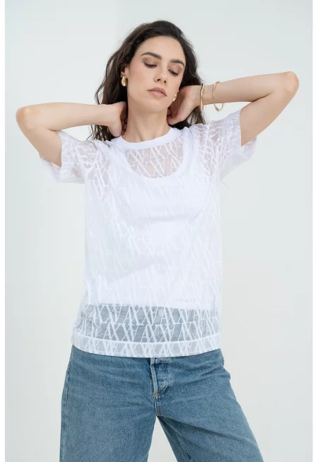 Десенирана памучна тениска - Бял/Черен/Сребрист