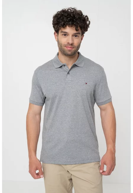 Тениска от памук с яка - Меланж тъмно сиво