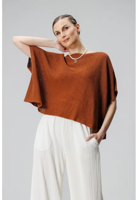 Ленена тениска с ръкави тип прилеп - Кафяв